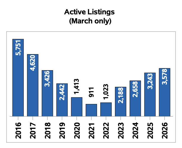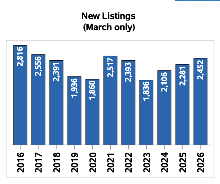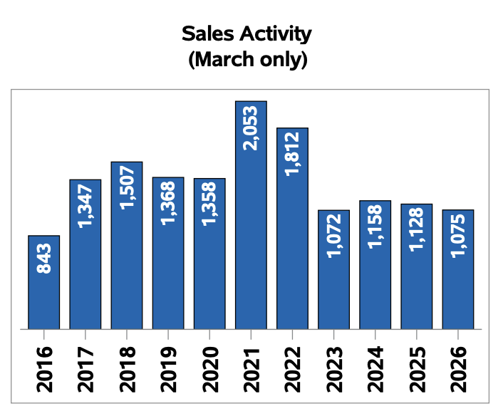 Year-to-date, 2,474 homes have sold, a 5.7% decline from 2025, while dollar volume sits at $1.66 billion (-6.5%). Despite this, March showed stronger momentum than earlier in the year, driven in part by single-family homes, which recorded 562 sales, unchanged year over year, and well above February’s 358.